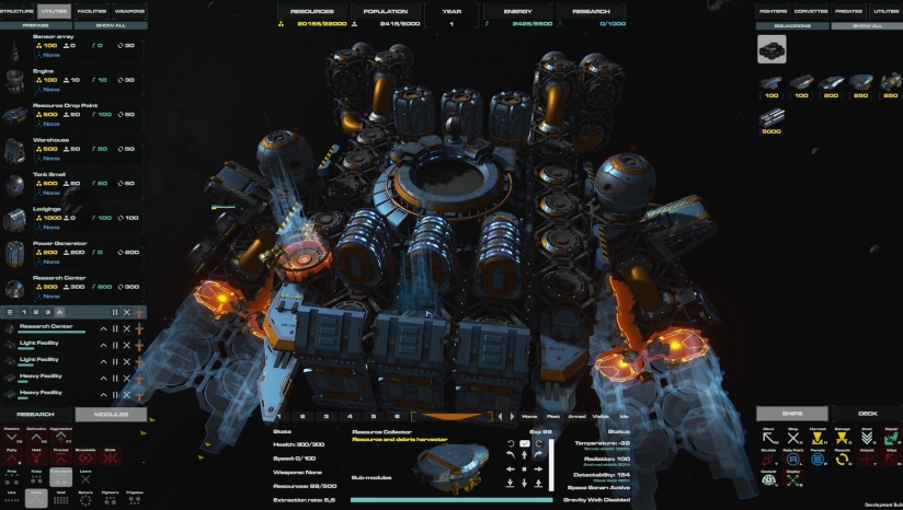 玩家需从零搭建空间站,通过模块化设计自由组合能源设施、造船厂、科研中心等建筑,并优化资源链以维持基地运转。