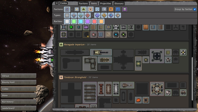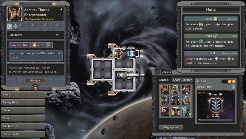 每一位舰长都有着截然不同的风格:出奇制胜的被动、千奇百怪的船体布局以及意想不到的阴谋诡计。虽然舰长会影响商店物品池,但这并不妨碍你灵活借用其他派系的手段。不拘一格,为海盗劫掠船搭配外星生化科技或者是帝国装甲也无妨。