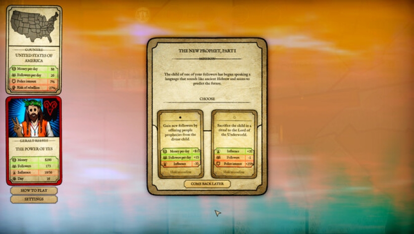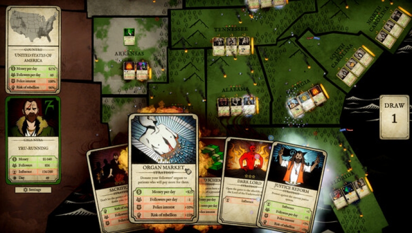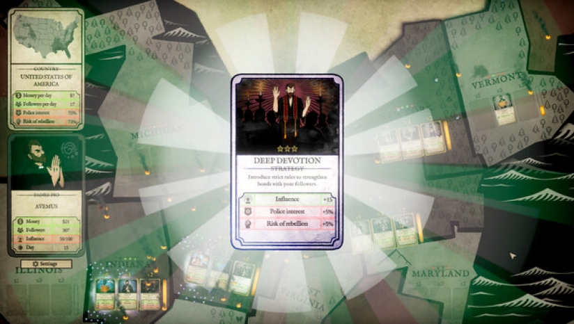 制定策略:打出战略卡牌,扩大你的邪教,将其发展成一个强大的组织。每个决策都会带来影响:有些会吸引信徒,有些会引起当局的怀疑。