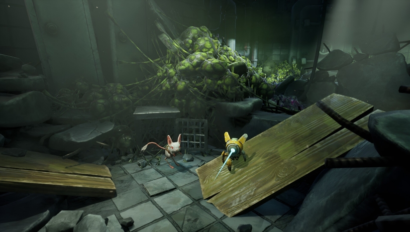 齿轮管道、破损实验室与辐射污染区构成主场景,冷色调金属与沙鼠暖色毛发形成视觉对比。