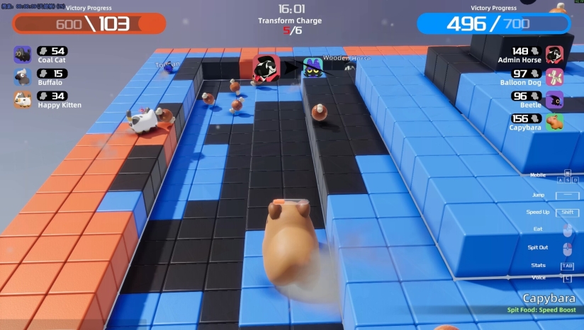 支持8名玩家(在线/本地联机)在动态地图中混战。角色拥有“进食膨胀”机制——通过收集食物体型持续变大,最终化为笨拙的“球状生物”,物理碰撞效果随之夸张化。创新玩法:随机触发2v6非对称对抗,两名“监护者”拥有特殊能力,需追捕六名“牛马”阵营玩家,阵营策略博弈成为胜负关键。每局结束支持即时合影,强化社交趣味性。