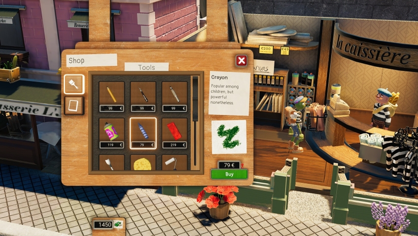 使用可折叠画架在街头或工作室即时创作并售卖画作,通过议价系统(点击天平图标)提升售价。