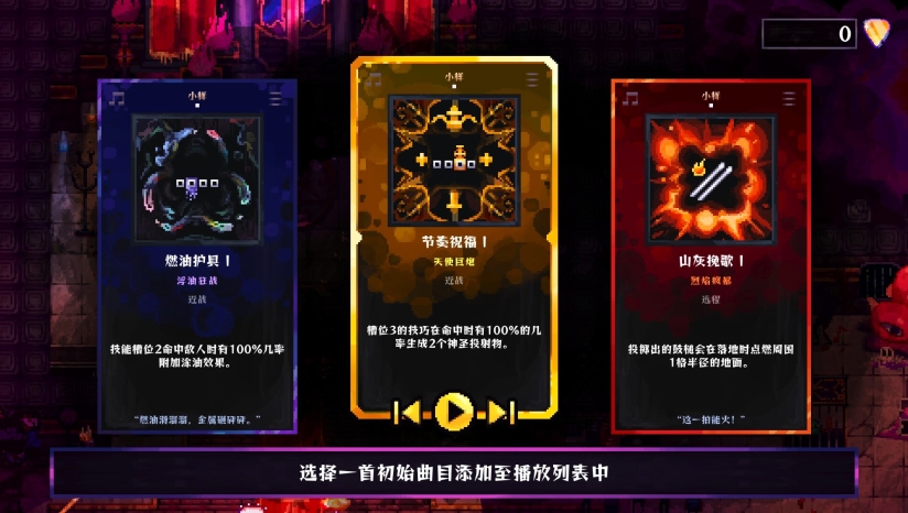 每关至少获取一张摇滚唱片(通关钥匙),插入关卡末端唱机后,从三种随机音乐力量中择一强化鼓棒(如污油之火、雷电或圣光),彻底改变攻击模式。