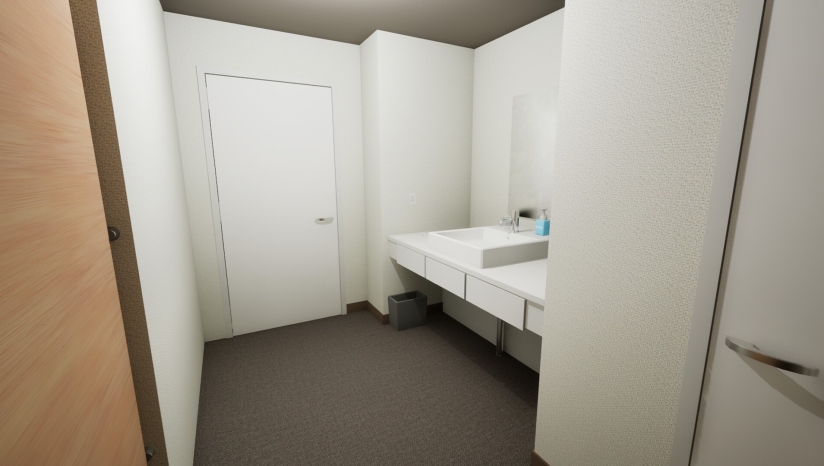 场景还原日本商务酒店的简约装潢(素色墙壁、标准化家具),通过光影对比(如走廊昏暗灯光)和细节纹理(浴室水渍、地毯磨损)强化真实感。