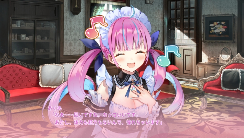 作为传统视觉小说,玩家通过阅读文本推进剧情,关键节点需做出对话或行动选项,分支选择将导向不同结局。游戏采用多视角叙事,部分章节可从配角视角体验故事,如贵族姐姐「白上吹雪」或女仆前辈「宝钟玛琳」,深化角色动机与世界观。全流程约10-15小时,推荐攻略顺序为:先完成玛琳与吹雪的支线,再解锁阿库娅的主线结局。