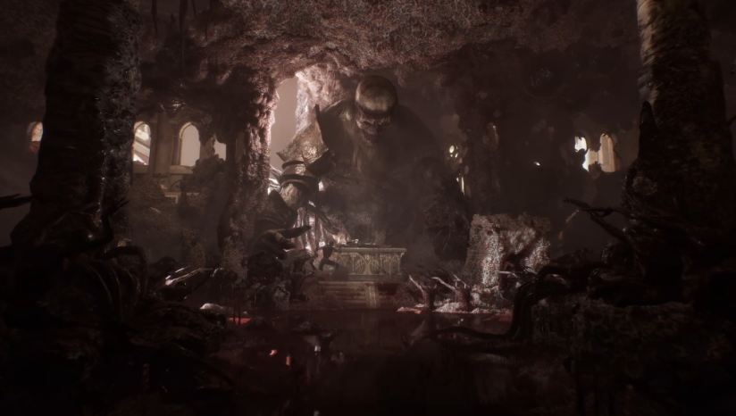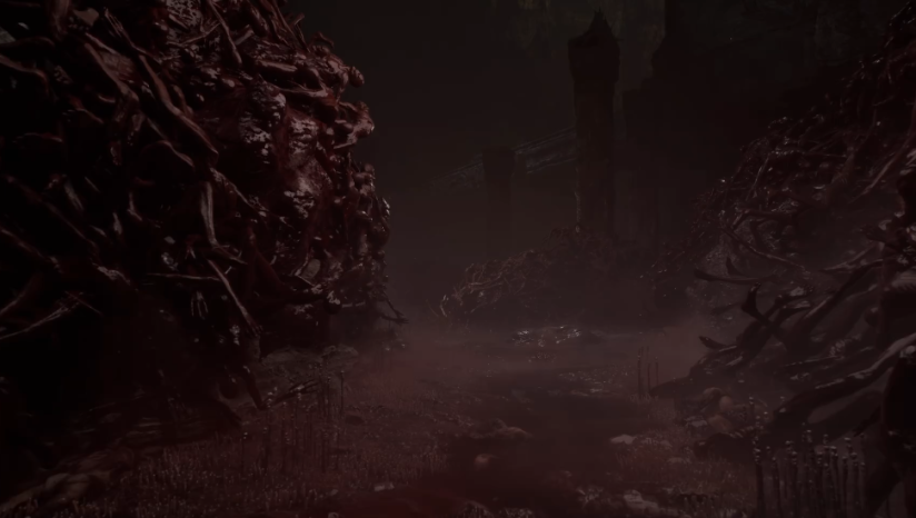 室外以橘黄色调与弥散雾气营造“神之凝视”的压迫感;室内采用血色与昏暗光线直击血腥恐怖。场景中巨型建筑、扭曲生物的设计紧扣克苏鲁主题。