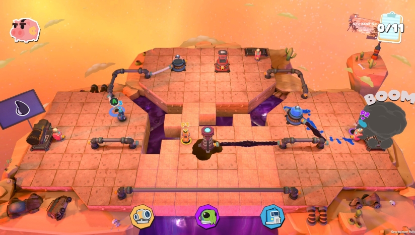游戏采用明快卡通风格,场景设定于外星沙漠、岩浆星球等奇幻地点,色彩鲜艳富有视觉冲击力。角色动作夸张幽默,如被燃料喷飞、跌入熔岩等演出强化喜剧效果;管道伸缩、燃料混合时的粒子特效和爆炸动画,进一步烘托混乱氛围。优化方面,最低配置仅需GTX 630显卡,主流设备可流畅运行。