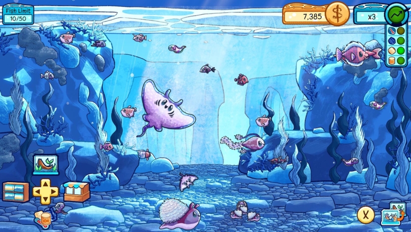 四个鱼缸各有不同的主题与鱼类组合,灵感源自现实世界的鱼类并融合了魔法元素。翡翠波光(Emerald Ripple)、珊瑚之境(Coralspire Reef)、冰封深渊(Frozen Abyss)、魔法之湾(Magic Cove) 每个水族箱都有独特的鱼种等待玩家解锁和照料。