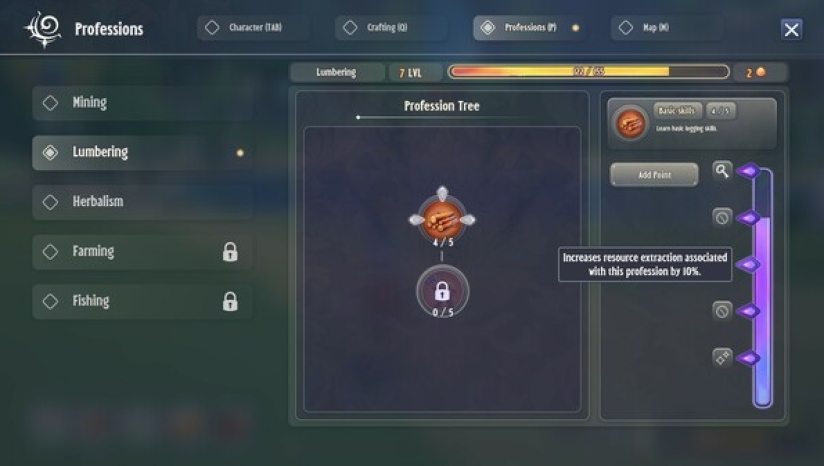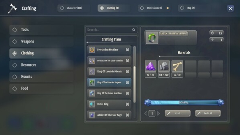 3、通过掌握采矿、草药学和捕鱼等基本职业来发展你的角色。提升技能等级以解锁强大的配方和工具,从而制定生存策略并改善旅程。