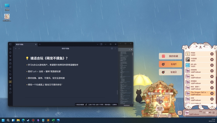 无论你在上班工作、打字、学习、编程、游戏,还是刷剧摸鱼,你的专属萌宠都在屏幕边悄悄陪伴: 打字同步、挂机掉宝、帽子换装、房屋装饰、小游戏解压、白噪音冥想…… 在猫咪小动作与轻音乐之间,感受生活每一刻的小治愈。