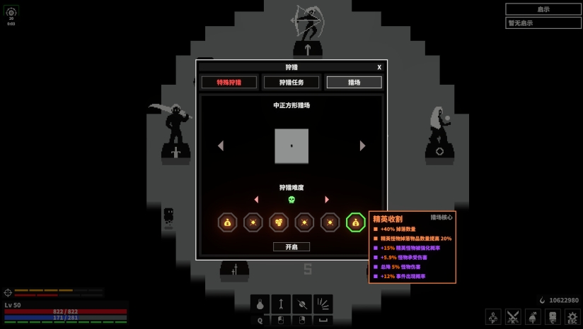 简中《漆黑猎场》是由The Bueno Interactive发行的极简像素风动作RPG构筑刷宝游戏。玩家化身猎人协会新成员,肩负对抗虚空侵蚀的使命,在快节奏战斗中狩猎怪物、收集战利品以壮大自身,最终挑战虚空源头。游戏摒弃冗杂剧情,直入战斗与构筑核心,提供多维度联动的深度构筑系统,玩家需通过精妙策略组合技能与装备打造专属玩法。刷宝体验持续优化,从初期手忙脚乱逐步过渡到自动化乐趣。随着探索深入,更强大的虚空首领等待挑战,激励玩家追逐极限构筑。