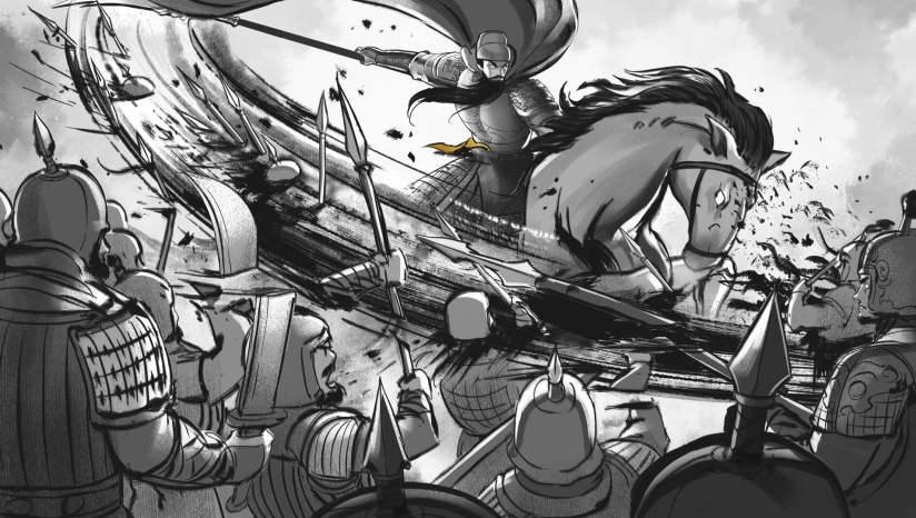 结合真人演出与水墨动画过场,连环画式分镜呈现关键战役(如“三英战吕布”水墨动态渲染);
