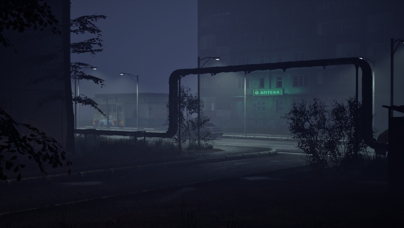低饱和度色调搭配冷色光源,辅以雨滴击打玻璃的动态效果,构建出压抑而诗意的废墟美学。