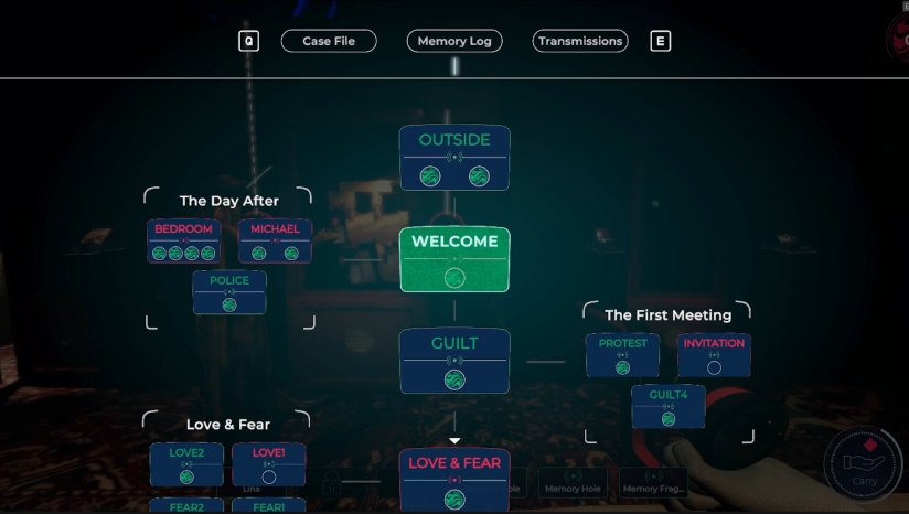 谜题设计强调逻辑唯一性——答案合理但需反复推敲。玩家需观察场景细节(如扭曲的派对现场),结合线索建立关联,解锁真相。失败将触发记忆崩塌,需调整策略。