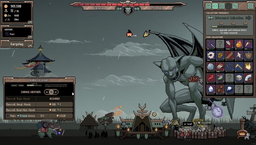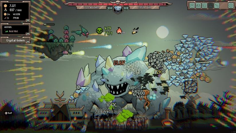采用复古像素美术,巨型Boss的陨落动画在城镇中全景呈现,形成强烈的视觉反差。