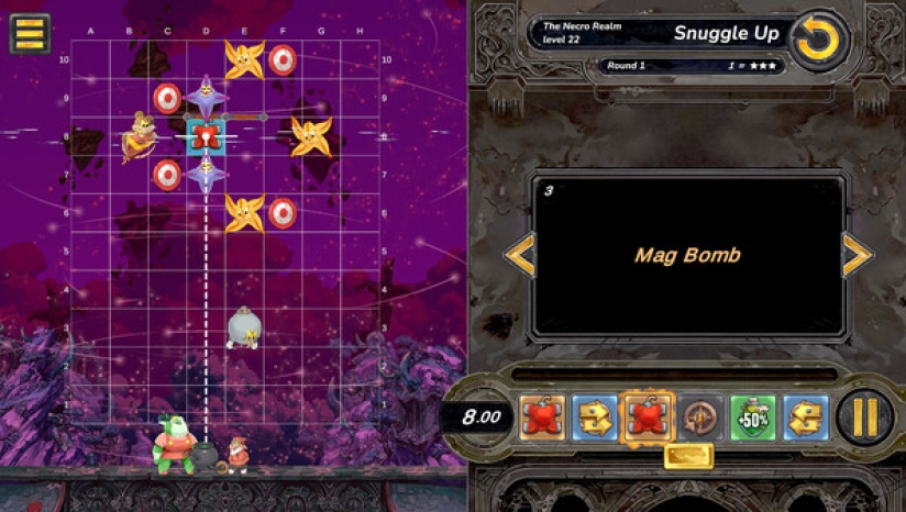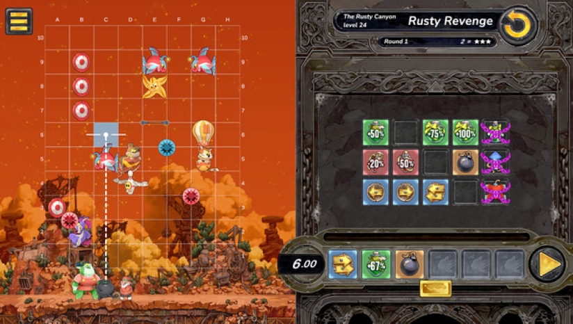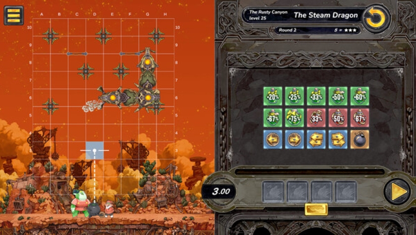 每一关都会提供一组动作方块,可以插入到动作序列中。序列长度因谜题而异,并从左到右执行。动作包括:左右移动、药水增强或削弱大炮威力、爆炸物库,以及“等待”和“循环”等辅助操作。