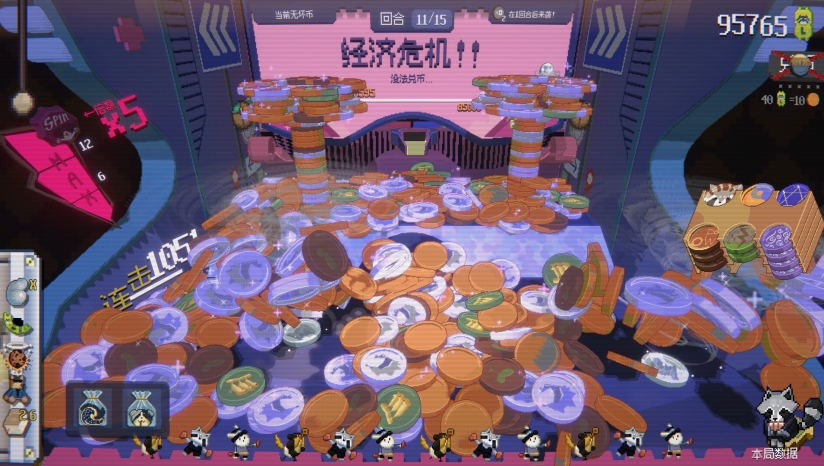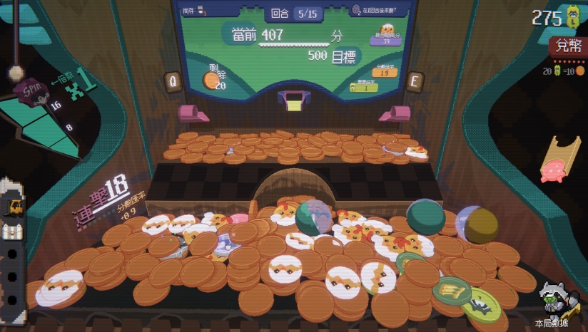 游戏采用鲜明的像素画风,营造出充满活力的街机氛围。推币机的物理效果表现拟真而不过于复杂,代币的碰撞和下落轨迹既带有一定的随机性,又不会破坏游戏体验。游戏界面设计清晰直观,各种代币和道具都有独特的视觉表现,使玩家能够快速识别不同元素。连击触发时的特效反馈和数值膨胀的视觉呈现,为玩家提供了强烈的多巴胺刺激和满足感。鲜艳的色彩搭配可爱的浣熊角色设计,进一步增强了游戏的吸引力和娱乐性。