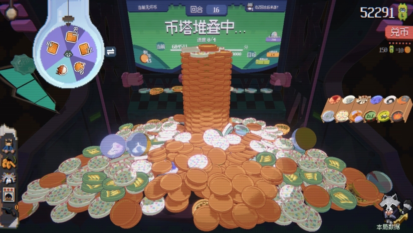 游戏核心规则简单而深刻:玩家投入代币,通过推币机机制将代币推落平台,依据“代币分数×分数倍率”计算得分,每个回合需达成目标分数才能进入下一关。游戏创新性地融合了Roguelike元素,玩家可以解锁100多种独特道具,通过特殊代币的搭配触发协同效果。游戏内资源系统设计精巧,代币掉落不仅产生分数,还会提供“票票”奖励,用于商店购买或兑换代币。玩家需要管理币夹系统,通过横向或纵向扩容增加代币携带量,并搭配芯片、礼品和挂件等道具构建强力组合。