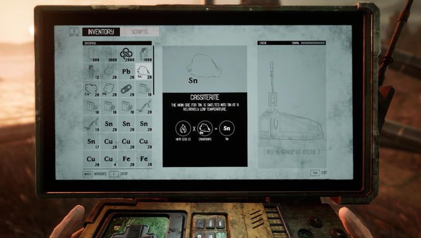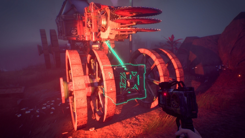 游戏玩法融合了探索、资源收集、建造与自动化。玩家需要在广阔的开放世界中搜寻资源和制作工具,建造模块化机器、建立基地、获取电力甚至设计自动化流程。岛屿上散布着公司设置的试炼,这些试炼的设计思路类似于《塞尔达传说:旷野之息》和《王国之泪》中的神庙挑战,完成试炼可获得永久增益效果,用于升级装备并解锁更先进的科技。生存机制的核心是理智管理。相比传统的饥饿与口渴,保持理智是玩家最为迫切的需求。一举一动都会影响角色大脑化学物质的平衡,一旦失衡,角色就会“心神失控”(UNHINGED),陷入疯狂状态,如果未能及时恢复,将面临严重后果。