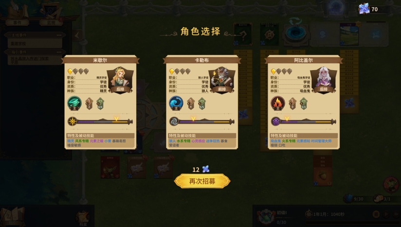 《巫师与学徒》的特色在于高自由度的学院经营与深度的卡牌策略结合。玩家可完全自定义学院,包括名称、校徽和教学理念,决定学院是全面发展还是专精一处。游戏提供了丰富的收集要素,包括300多种可收集的建筑或卡牌、120多种可研究的蓝图、200多个主线和随机事件,以及100多种不同的巫师职业和200多种随机学徒特性,确保了游戏的高重玩价值。游戏中的随机事件系统让玩家需要应对各种突发状况,如学生冲突、研究突破或外界威胁,每个决策都会影响学院的发展轨迹。多元化的学生系统也是一大亮点,不同种族的学生拥有独立的成长路线和技能树,通过课程安排和实战训练,玩家可以培养出各具特色的魔法人才。
