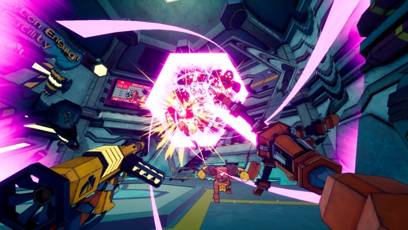 《反抗引擎》采用了独特的视觉风格,将色彩缤纷的第一人称动作与冰冷的赛博朋克环境有机结合,形成了一种复古与科幻碰撞的美学体验。游戏场景设定在庞大的企业高塔内部,从危险的工业设施到公司高层,环境变化丰富,营造出压抑与希望交织的氛围。机器人角色的设计细节丰富,战斗时的爆炸、激光等特效绚丽夺目,特别是终结技施展时的巨型激光与等离子爆炸,极具视觉冲击力。其画面表现既致敬了90年代复古射击游戏的视觉特点,又融入了现代图形技术,打造出一个既怀旧又新潮的赛博朋克世界。