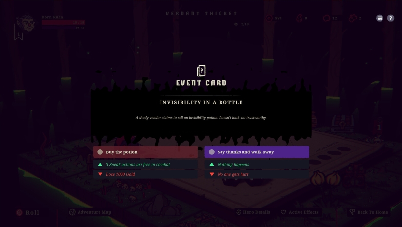 面对奇异事件,战斗怪异敌人,决定是带着战利品回村,还是冒险再走一步以获取更大的回报。每个英雄都会穿越八个危险区域,每个区域都有独特的氛围、敌人,以及基于回合的随机棋盘。掷骰子前进,穿越陷阱、宝藏、事件和致命的敌人。