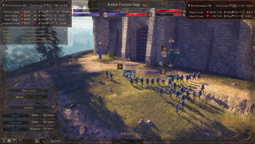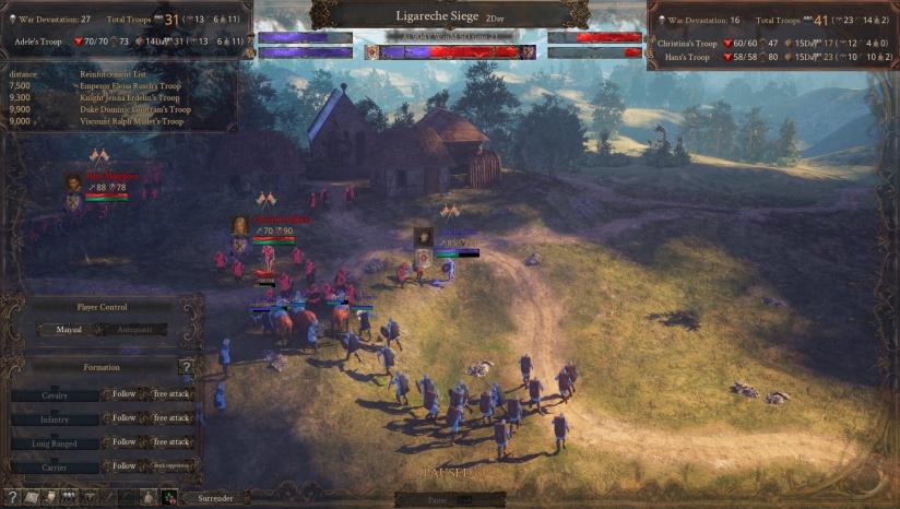 《历史的终结》提供了高度自由的玩法系统。玩家可以从底层开始,通过完成委托、参与贸易或军事冲突来积累经验和财富,逐步解锁多元职业路径,如盗贼、商人、骑士等。随着声望提升,玩家可以晋升为贵族管理领地,甚至建立自己的国家。游戏包含多维身份成长系统、动态领地经营机制和沙盒式战略推演。成为贵族后,玩家需要管理封地资源,建设农场、矿场,训练军队,并平衡税收与民生需求。战斗系统支持自由行军作战,玩家可以组建混合兵种军团实施战术包抄,利用地形优势设伏突袭。外交系统也是一大亮点,玩家可以缔结同盟、策反敌方将领,甚至策划宫廷阴谋颠覆政权。所有行动都会引发连锁反应,改变游戏世界的势力格局。