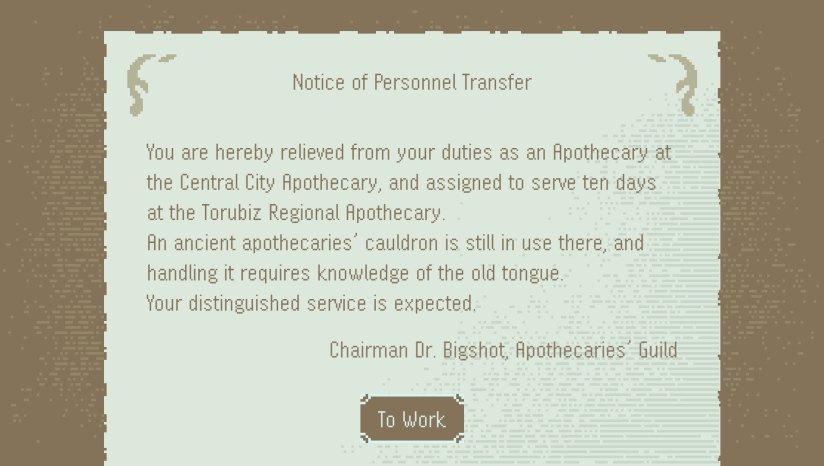 简中《特鲁比兹的秘药师(The Apothecary of Trubiz)》是kinjo与Image Labo联合制作、kinjo发行的短篇解谜游戏。玩家将化身药师,面对来访病人的病情,需解读全是虚构语言的药剂手册,通过假设翻译、调配药剂并试药验证功效,在“从看不懂到读懂”的过程中体验解谜快感。游戏融入黑色幽默元素,治疗结果会触发不同小故事,翻译信息与调合记录可跨回合继承,失败后仍能带着已有情报重新挑战,以轻松氛围呈现一场兼具语言探索与药剂调配乐趣的独特冒险。