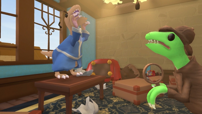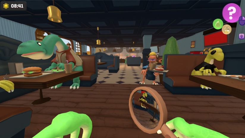游戏采用3D卡通渲染风格,营造出一个色彩鲜明、充满张力的世界。场景设计注重细节,如破败的酒店环境与恐龙世界的原始感相互映衬,强化了剧情的荒诞氛围。角色造型突出“拟人化”特点,恐龙形象兼具动物特征与人性化表情动作,使互动过程更具戏剧性。界面设计简洁明了,确保玩家能专注于解谜。整体视觉风格在复古与创新间取得平衡,成功烘托出游戏悬疑中带幽默的独特基调。