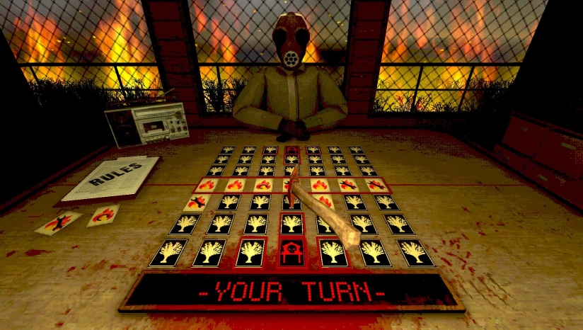 采用第一人称3D视角,暗黑写实美术风格强化沉浸感。火焰燃烧特效随游戏进程动态升级,窗外火光与卡牌燃动细节营造真实焦灼感。游戏支持自动画质调节,确保帧率稳定在45fps以上,立体声音效与面具男的阴森音效进一步烘托恐怖氛围。