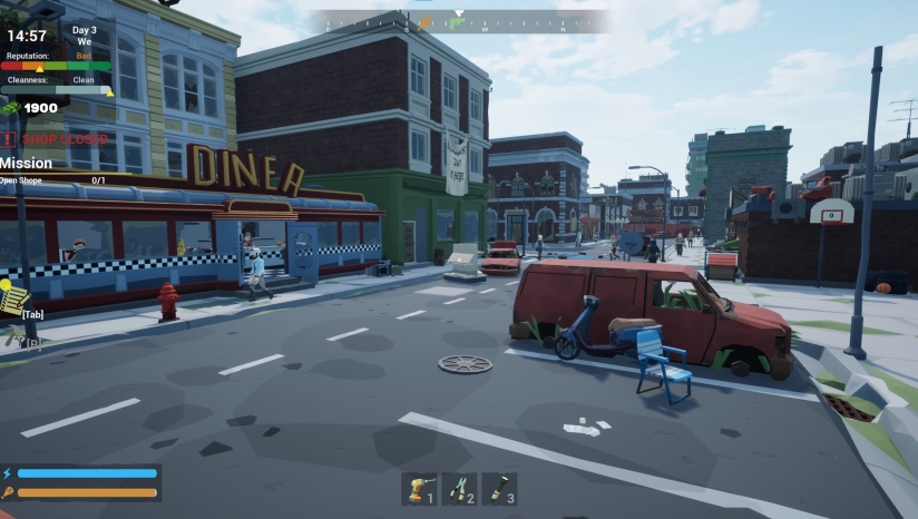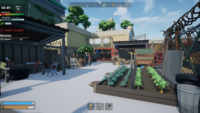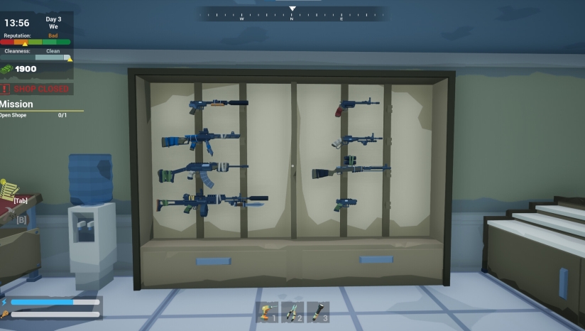 作为一款武器商店模拟经营游戏,玩家需要管理一家末日中的枪械工坊。核心循环包括:搜集或购买武器零件、设计和组装枪械、定价销售、升级店铺设施以及雇佣工人。玩家需要平衡资源分配,通过工作台将200多种零件组合成实用武器,并巧妙陈列以吸引居民购买。随着游戏进展,可解锁更多高级工作台和功能设备,如拆卸零件换取材料的装备。游戏还引入了简单的生存要素,例如玩家可以购买和食用热狗补充体力。经济系统要求玩家谨慎定价,利用“完整组装奖金”机制提高利润,从而不断扩大经营规模。
