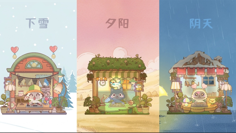 游戏采用清新可爱的2D美术风格,界面设计简洁治愈。猫咪角色动作细腻,包含眨眼、伸懒腰、打滚等多种生动动画,玩家甚至可以通过点击猫咪不同部位触发互动彩蛋。游戏环境注重氛围营造,拥有多场景天气系统,例如现实中的降雨会触发猫咪在窗边看雨的特定动画,深夜模式则会自动调暗画面并触发星空投影特效。猫屋和桌面装饰系统允许玩家高度自定义,从墙面、地板到各种摆件均可自由布局,且装饰品会与猫咪产生趣味互动,共同营造出一个充满个性化与治愈感的数字空间。