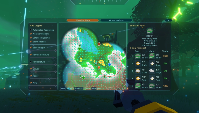 改造星球,追踪气象:使用加工后的材料,你可以建造并运行一个系统来控制气候,跟踪气象,改造地貌。随着地貌改造的进行,行星将能生成更多样的天气,其中一些天气具有相当的破坏性。游戏中实现了一个动态气象系统,它可以和地理环境交互作用,并根据全球气候产生区域性微气候。