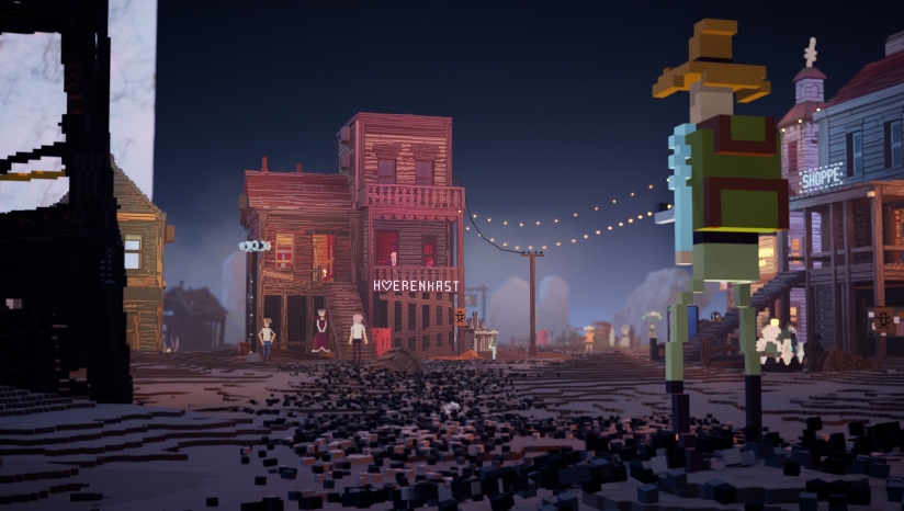 《噬时荒野》采用独特的体素美术风格,结合后末日荒野西部的基调,营造出一个既荒凉又光怪陆离的世界。场景充满可破坏的细节,基于物理的破坏系统使得战斗与环境互动充满视觉冲击力。游戏世界在时间推移下的视觉变化也是一大亮点,从建筑更替到地貌变迁,均通过体素艺术生动呈现,增强了时空流转的沉浸感。