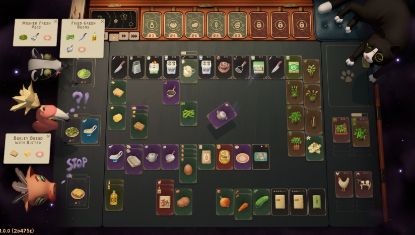 1、卡牌构筑:玩家需通过摆放卡牌制作菜肴,简化传统烹饪操作,强调时间管理和策略布局。