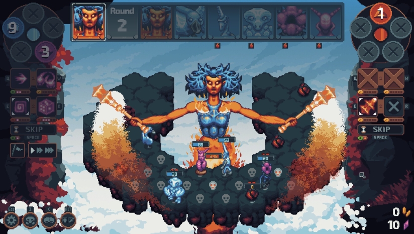 游戏的核心玩法是基于六边形网格的回合制战斗。战斗发生在程序生成的飞行岛屿上。玩家需要指挥名为“Primals”的单位,利用各自独特的技能来出奇制胜并消灭敌军。每次冒险都是全新的体验。战后,玩家会获得奖励,并需要选择新的Primal加入团队,这意味着必须根据随机提供的单位即时构建阵容,灵活应对。资源管理至关重要,因为每个单位的4种技能会消耗或生成“法力”资源。