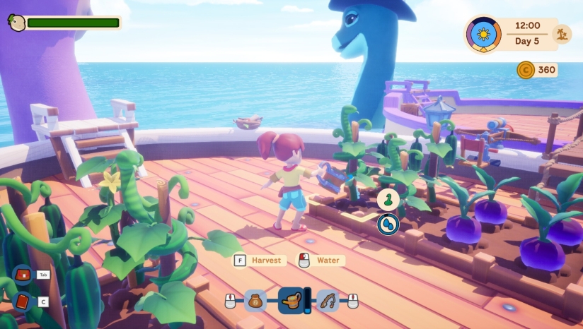 作为一款融合了海洋探索与农场经营的模拟游戏,玩家将扮演一名寻宝人,在未知海域中航行。核心玩法包括在甲板上开辟农场,培育珍稀作物,以及在海水和淡水中钓鱼,收集特殊鱼类。游戏独创的“寻宝名录”系统记录了超过200种动植物与文物,完成收集可以解锁专属装饰与船只升级蓝图。玩家需要制作实用工具来帮助船只驶过不同气候区域,并可以随心所欲地装饰自己的船只。这段冒险旅程并非孤身一人,一位形似鲸鱼或拉普拉斯的巨型海洋生物伙伴将陪伴左右,玩家需要通过与它培养感情,甚至通过喂食来维持其航行效率。