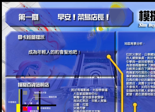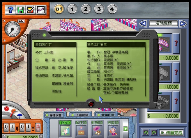 另外,这类游戏除了要好好管理专柜外,顾客的满意度当然更是百货公司能不能成功的关键,《模拟百货》游戏中自然也在这方面下了不少功夫,不同年龄层的顾客将随着四季变换不同的服饰,也会随着心情有着喜怒哀乐与生病的表情,当然更会依逛街路线附近的情况与专柜陈列的物品而有心情上的变化,游戏将顾客的购买能力与习性分成几类,玩家不但可以随时监看顾客的购物情况,更可以知道他们脑袋瓜里到底在想什么。