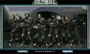 虽然《全球行动》中有超过36种经过授权的武器,其中包括8种手枪、6种冲锋枪、4种猎枪、4种机关枪、8种突击步枪、以及6种狙击步枪,但是最初玩家只能从少数武器中挑选。例如只有选择了狙击兵专业的玩家才可以购买H&K PSG-1,同样只有重型武器专业的玩家才可以购买M-60。然而这并不是说象侦察单位之类的兵种在游戏中不能使用狙击步枪。Barnhart说玩家可以捡起丢弃在战场上的任何武器,不过如果这种武器不属于自己的专业,那么玩家就无法达到该专业兵种的精通程度。因此如果一个玩家侦察员捡起了一支狙击步枪,,他或她可以用狙击步枪进行射击,但是不会与专长狙击的玩家一样精确。
