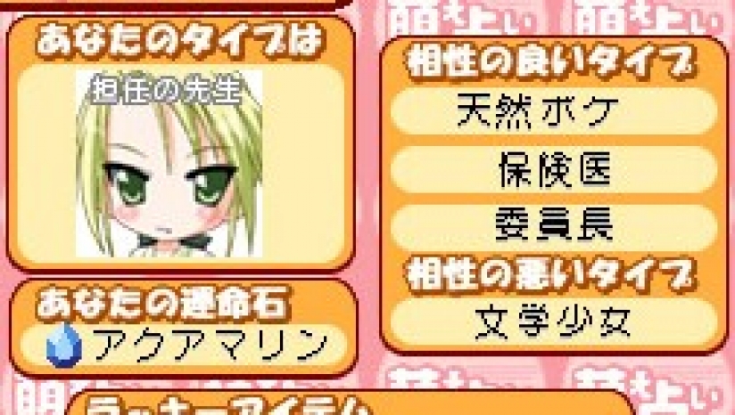 0人以漫画家美水的人气四格漫画“幸运星”为蓝本,游戏化的NDS游戏《真·幸运星 ~启程~》终于面世了,本作在游戏内容方面共分成“广播剧”、“练习”、“Wi-Fi对战”三大项目,其中在“广播剧模式”方面,是采用将圣地秋叶原加入女主角此方等人所居住的街道作为舞台的正统AVG游戏;至于一般AVG惯有的选择项目部份,则是改用各种“练习”测验的游戏结果来决定故事的分歧。而在“练习模式”部份,则大幅增加了包括“英文单字”、“方言问题”、“蛮横娇羞判断”等各式各样的问题量,并以每天一次的随机出题的方式来计算玩家的得分,借此判断玩家是属于“宅脑”还是“萌脑”类型。