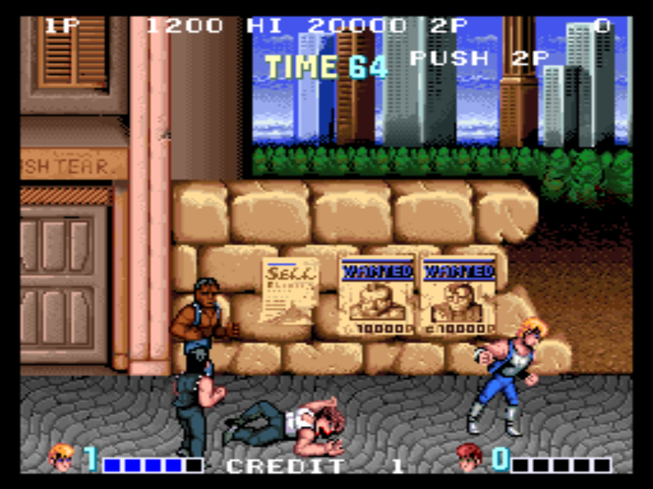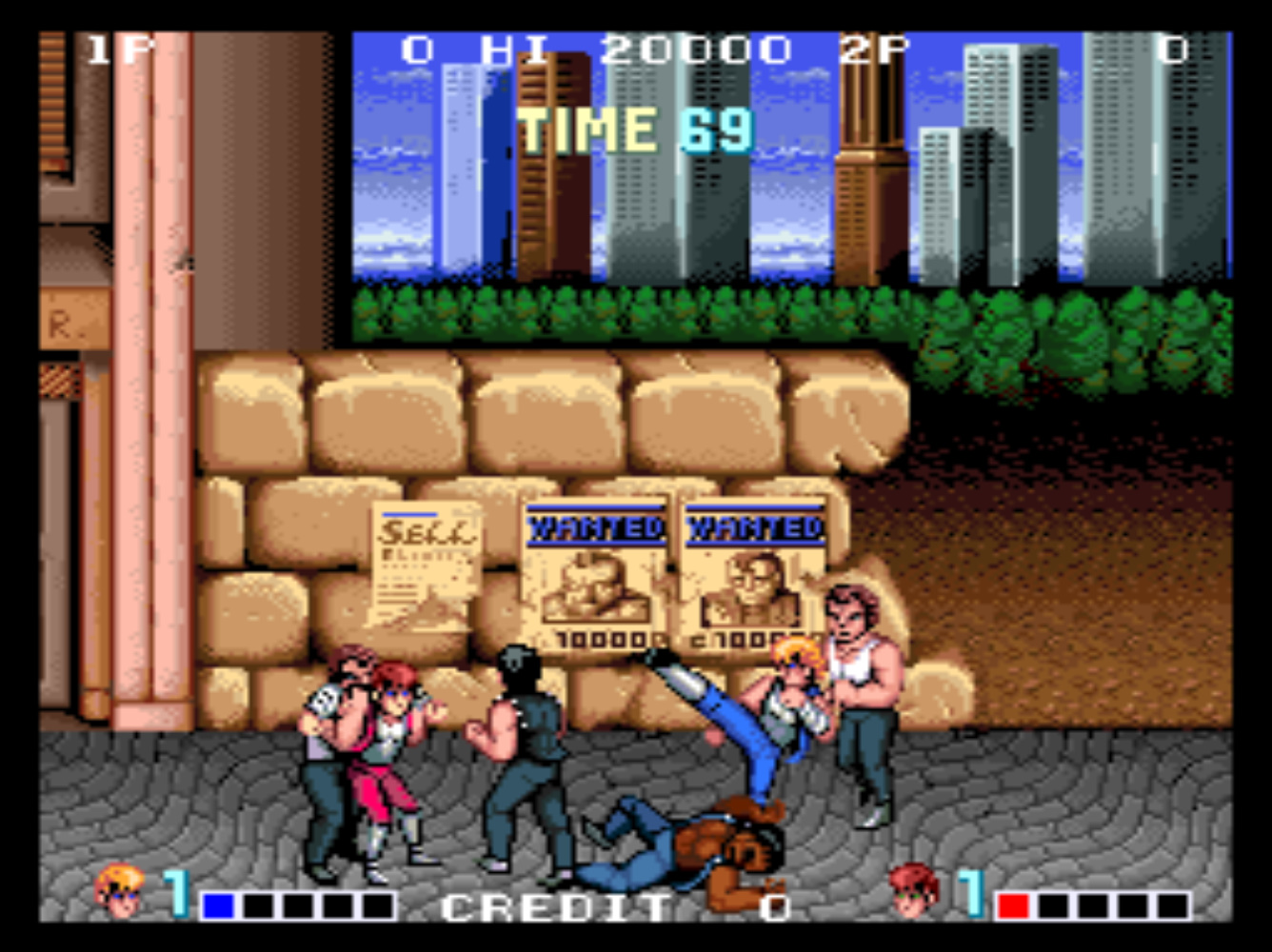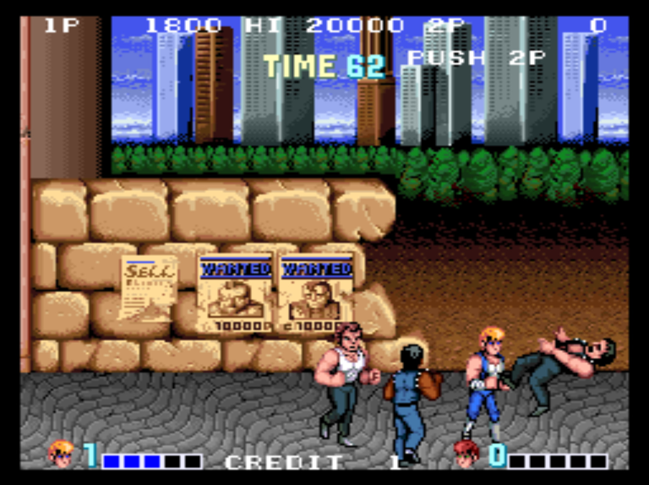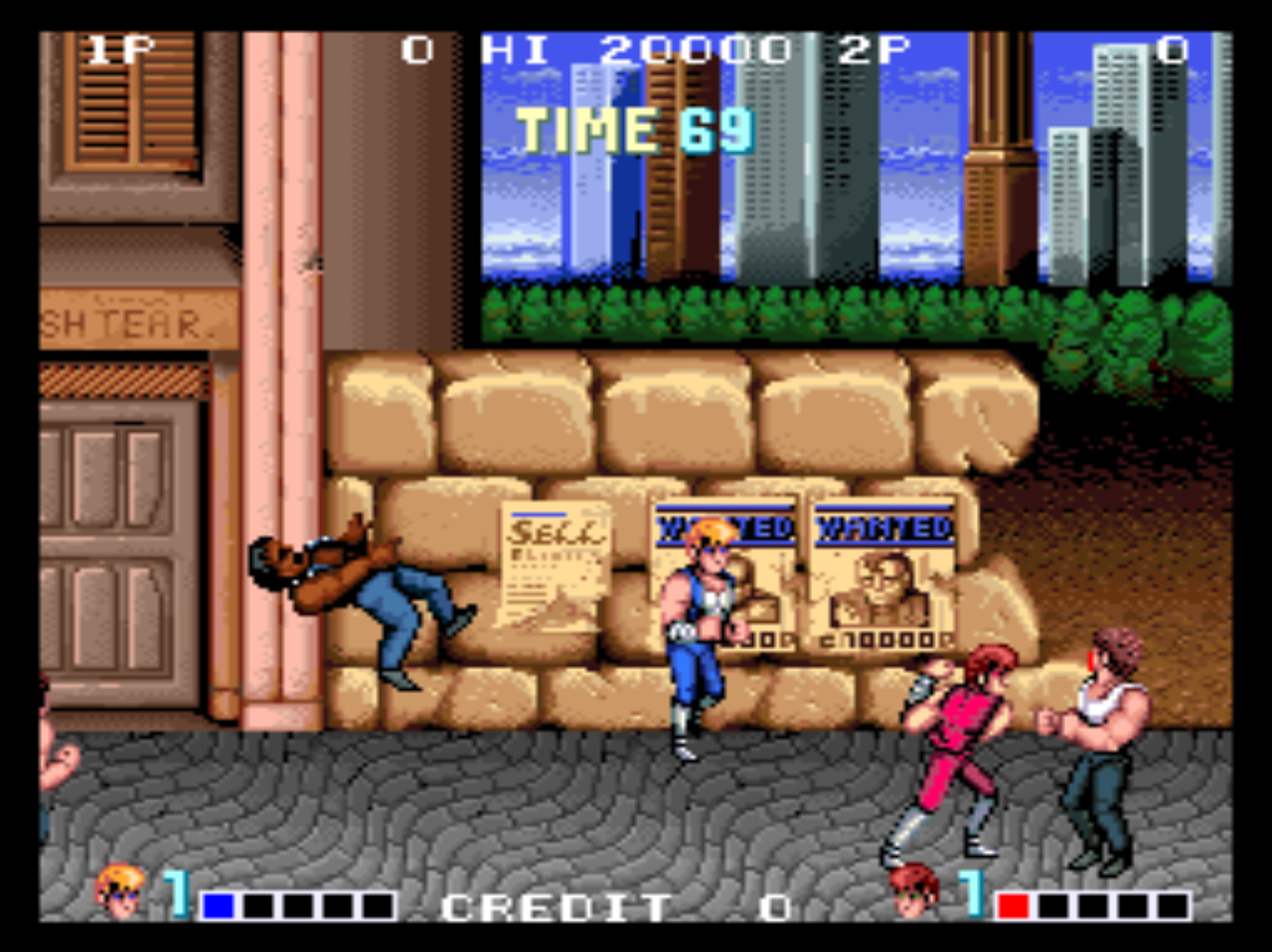 2人《双截龙(DOUBLE DRAGON)》是由TECHNOS制作的一款动作游戏,一代主题是救美,也支持人机对战,双人对战等模式。本款游戏有四种模式可供选择,分别是单人故事模式、双人故事模式、人机对战模式、双人对战模式。如果选择故事模式,按H键并等待播放片头后即可开始游戏;如果选择对战模式,按H键选择角色,选择好角色后,按J键或K键开始游戏。