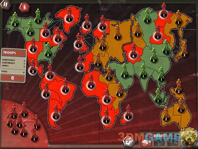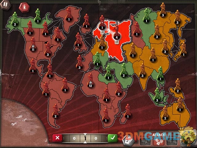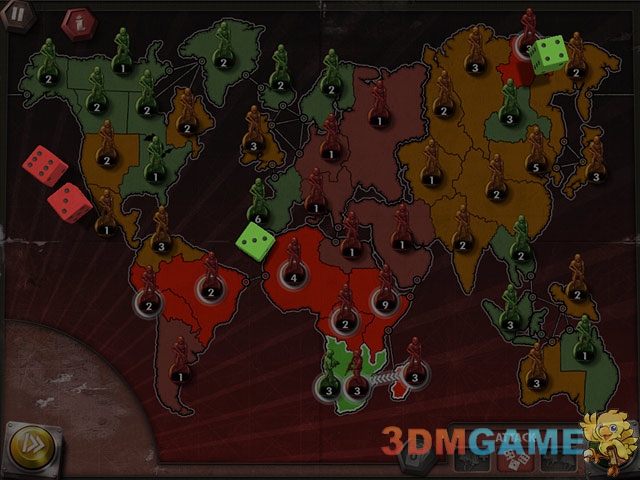 1人《大战役-RISK》是桌面棋盘策略游戏!游戏目标是通过控制世界地图上的所有领土来消灭对手,在每个回合中,玩家可以为自己的领土增兵、攻击对手并防御敌人。可与真实的电脑对手交火,或挑战多达5位多人模式玩家对手。