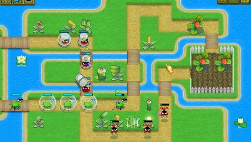 游戏采用2D横版塔防玩法,圣诞风格的花园和昆虫为背景和角色,画风清新可爱,卡通的角色风格活泼有趣,屏幕中充满了动态元素。虽然画风简单,但塔防的内容表现全面,玩起来颇富乐趣。
