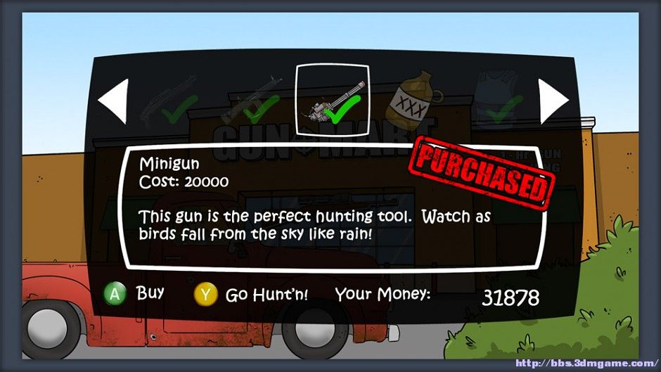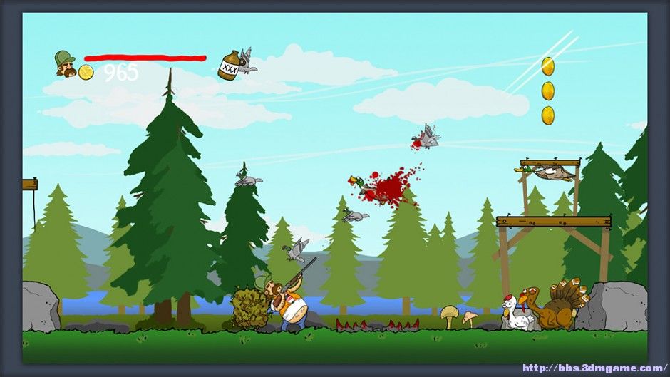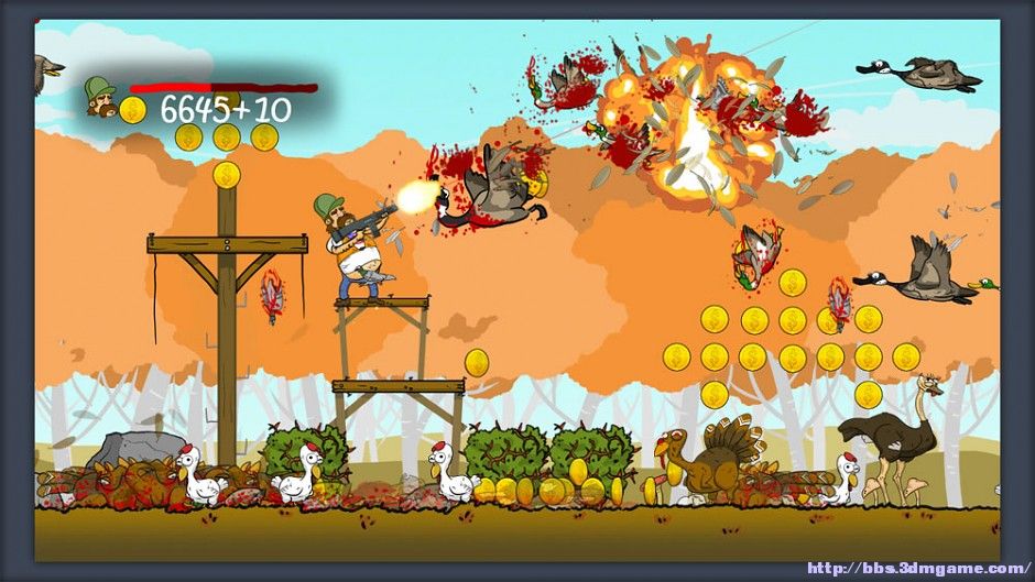 玩家杀死的鸟类越多获得金币越多,游戏中还包含了奖励关卡,抱起加特林,对着所有的鸟类割菜。每关卡完成后玩家可到武器商店中购买新的武器,狙击枪、ak47、加特林等等道具只要你有金币都可以买到。