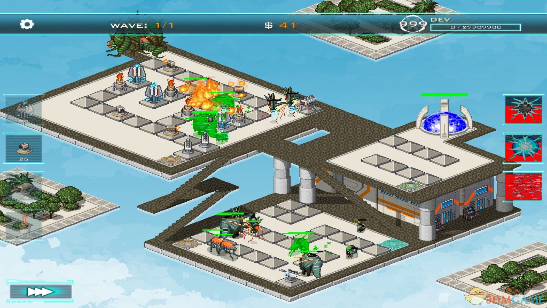 游戏中玩家要保护核心装置,建造让异形怪物抓狂的迷宫方块塔座,阻断它们畅通路线,让它们尽快能的绕远路。利用这点优势在塔座上合理位置建造武器,当然在金钱充足的情况下,你可以在所有塔座上建造武器。