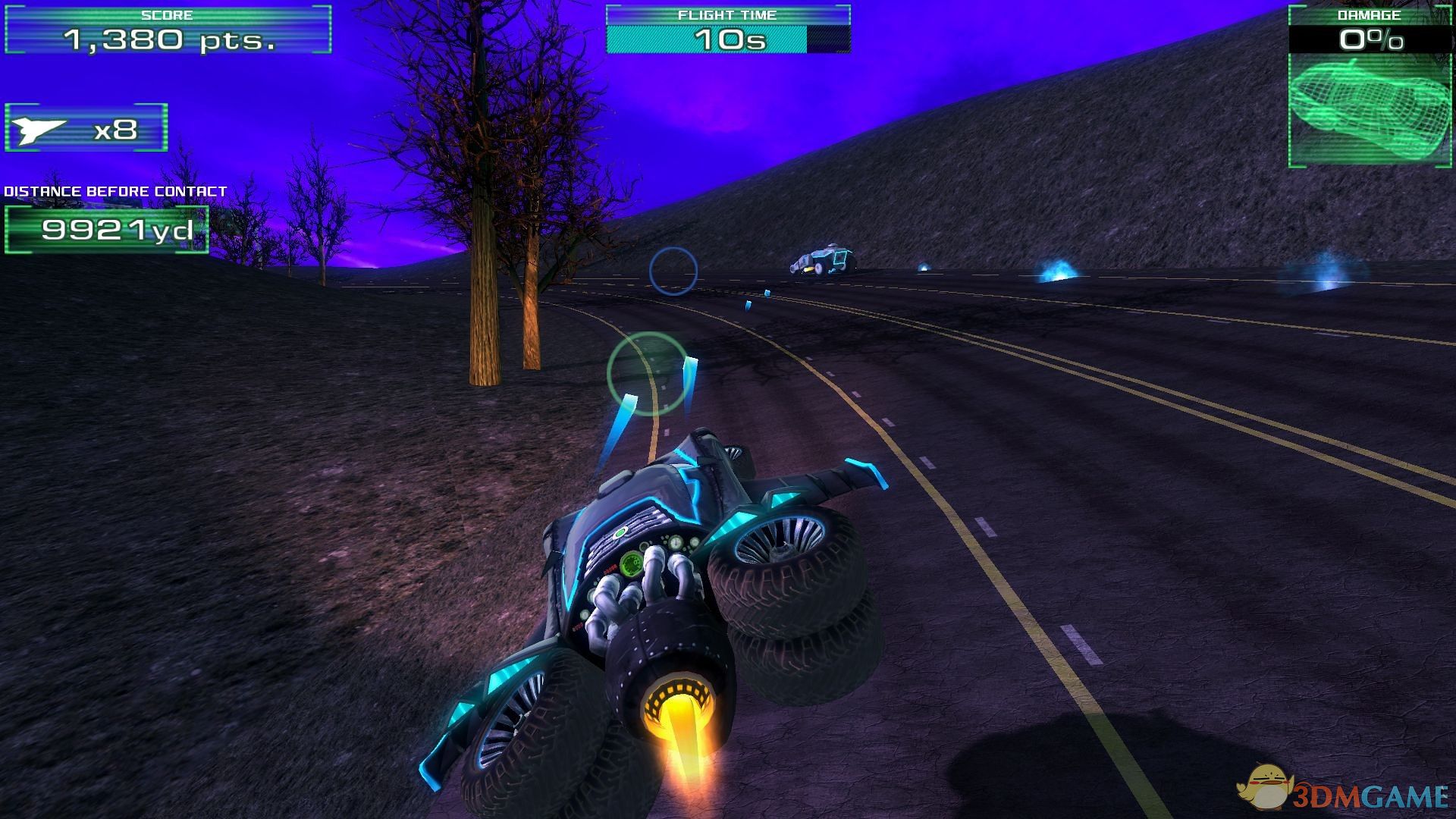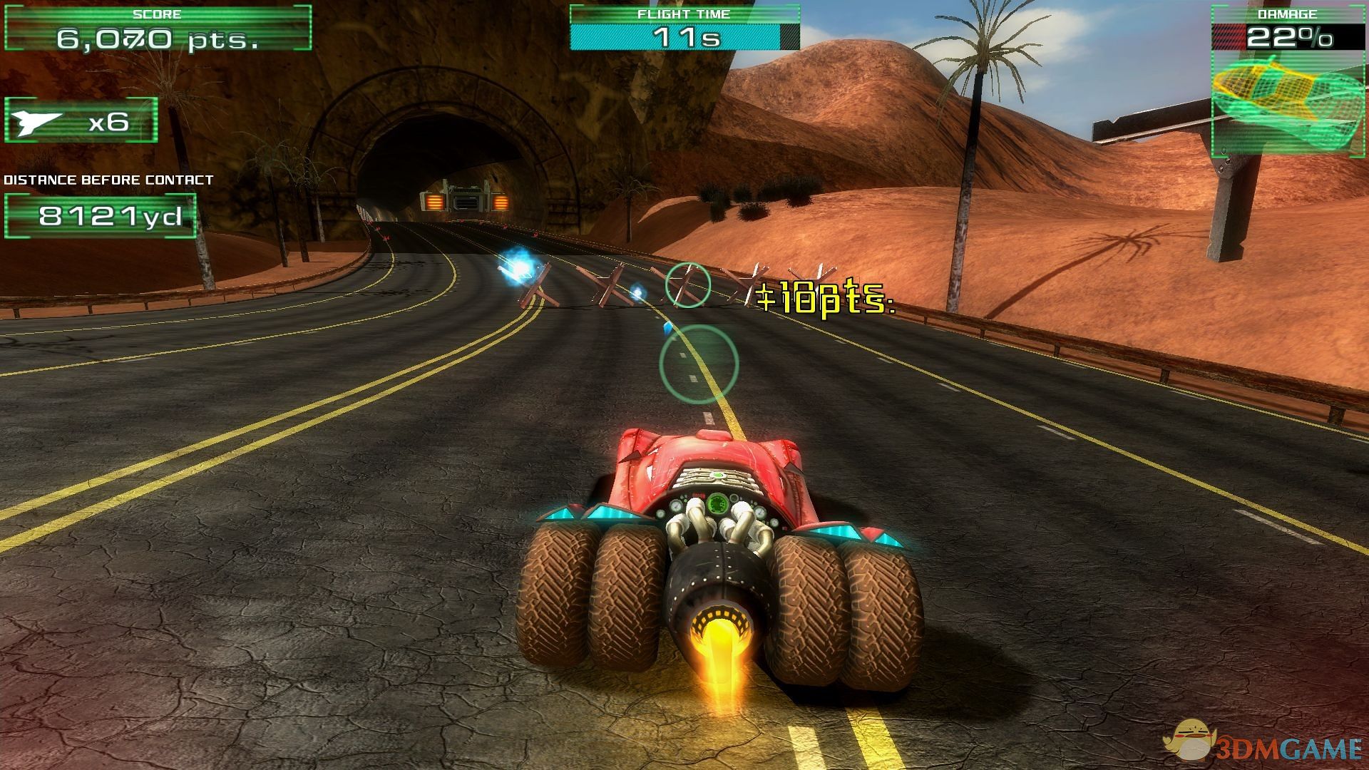 玩家驾驶飞车在公路上奔跑,不仅要躲避公路上的障碍物,顺带还要分心去射击在公路上的敌人,而且飞车之所以叫飞车可是能在空中飞好长一段时间的。经过一定时间会遇到关卡的BOSS,打败BOSS即可通关。游戏中右上角的飞车伤害达到100%时,任务失败。游戏关卡不多只有十个,不过又简单、中等、困难等三种难度来进行选择。
