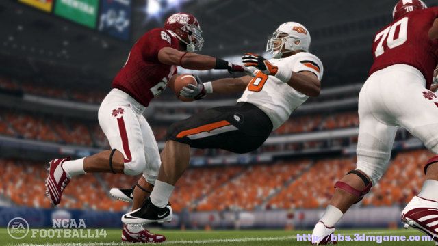 在美国最火爆的体育运动当属橄榄球比赛,这是一项智慧与力量相结合的运动,颇受美国民众欢迎,当然由此改编的体育游戏也能取得不错的销量,由EA公司出品的最新力作《美国大学橄榄球14》(NCAA FOOTBALL14),游戏预计2013年7月9日登陆PS3和XBOX360平台,喜欢橄榄球运动的玩家不要错过了。