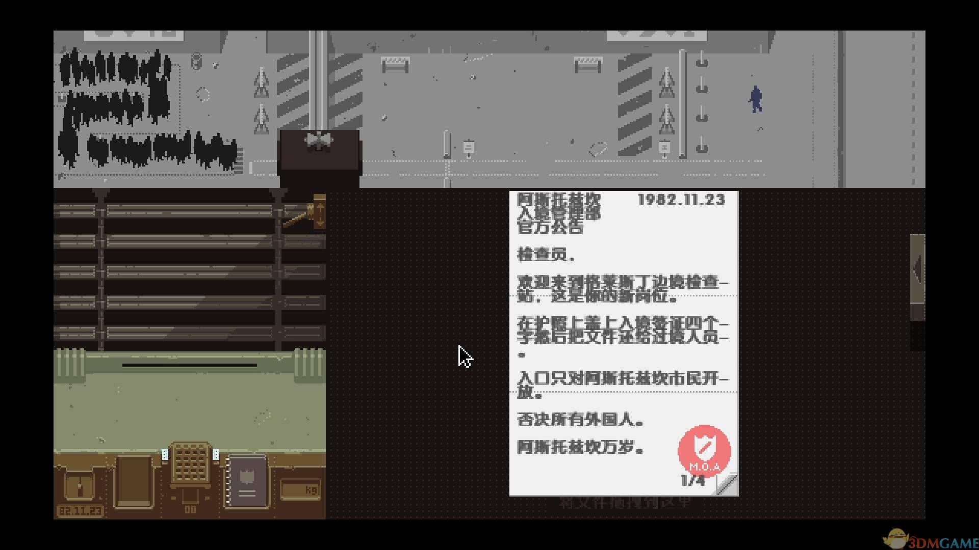 4人3909工作室制作发行的一款独立小游戏,你作为移民检查员,需要控制移民进入,阻止走私,间谍和恐怖分子等。一切都随你的想法来,你可以网开一面也可以铁面无私,你可以收受贿赂也可以公正廉洁。