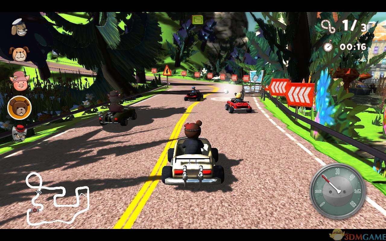 游戏的赛车类似卡丁车,玩家可以选择熊、小狗、小猪等不同的动物,在丰富多彩的森林跑道中磨练你的技术,游戏中也包含多种道具可以阻碍你的对手。5种不同的游戏模式可以让玩家在不同的挑战中竞速,生涯模式还可以让玩家打造属于自己的冠军之路。游戏支持解锁多个成就和成绩分享,3D 显示的画面初看可能会觉得有点磕碜,但仔细看看画面还是很有爱的,300M 的容量也从某个角度反映了丰富的内容。