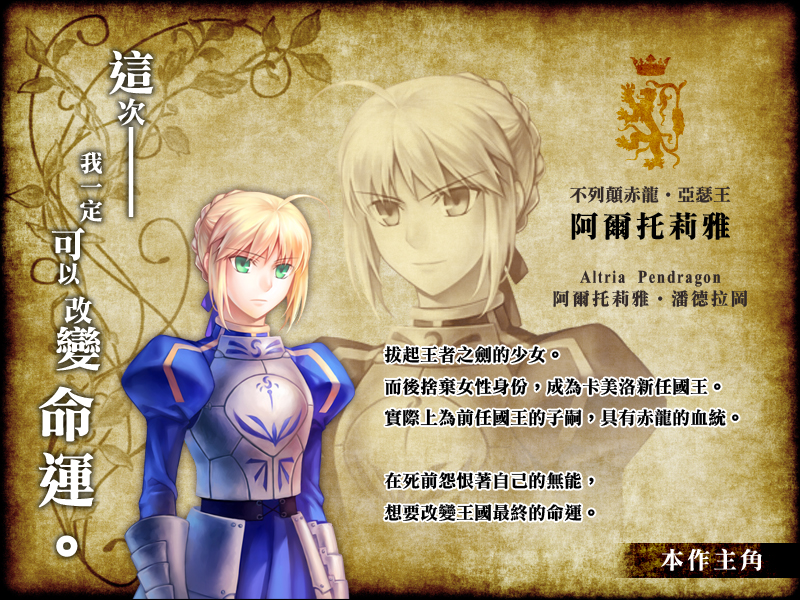 亚瑟王 (登场作品:Fate/Stay Night、Fate/Zero、Fate/Unlimited Codes、Fate/Hollow Ataraxia)